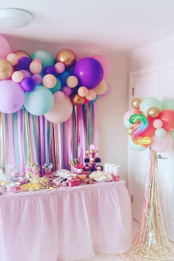 To recreate it, use balloons in soft pink, mint, lavender, and gold, and hang ribbons or crepe streamers behind the table.