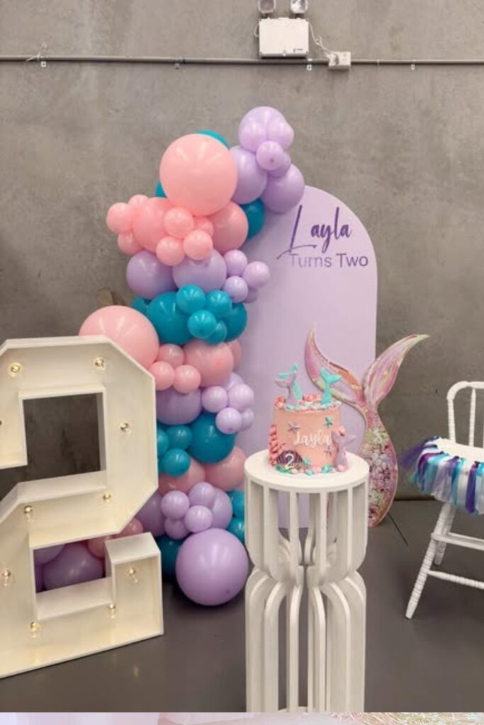A mermaid theme adds instant magic to a 2nd birthday with pastel balloons and seashell accents.