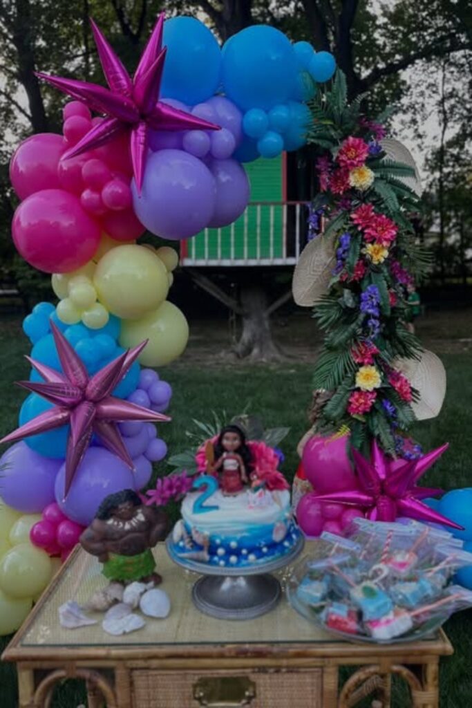 A themed cake and character figurines complete the look. Add string lights or tiki torches at dusk to keep the tropical magic glowing.