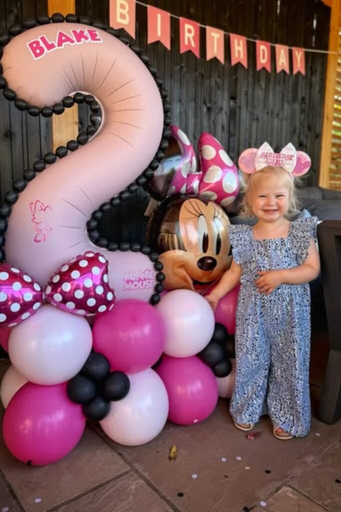 Minnie Mouse balloon and a giant “2” creates a playful focal point . Combine pink, black, and white balloons with Minnie style bows for detail.