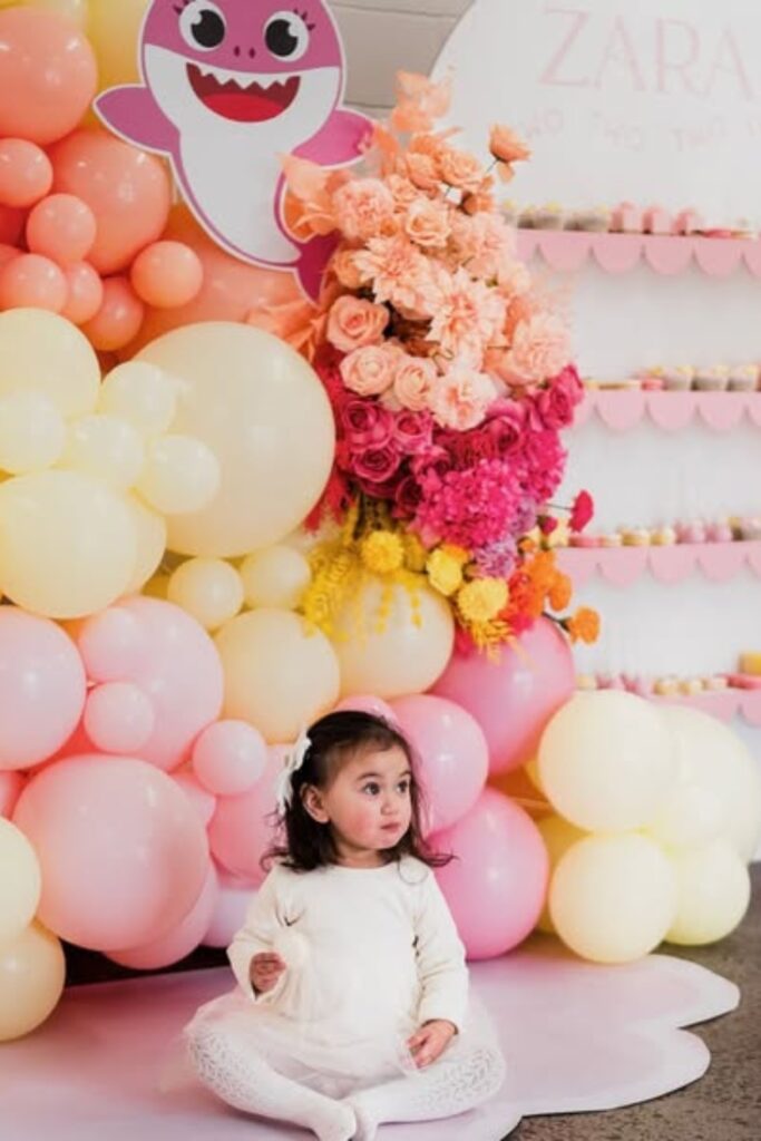 A Baby Shark theme gets a fresh twist with soft pastel balloons and bright floral accents.