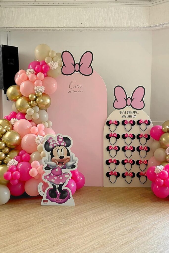 You have to pair pink, gold, and white balloon clusters with a Minnie cutout and a bow-themed backdrop.