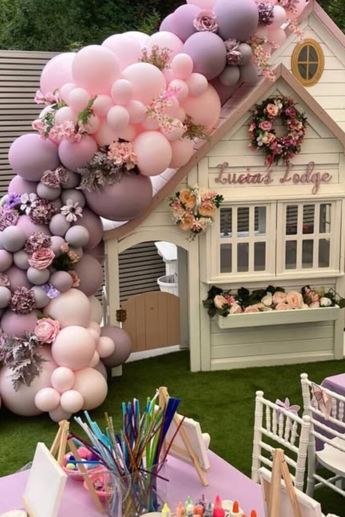 Make a playhouse into a magical focal point with a balloon cascade and floral accents.
