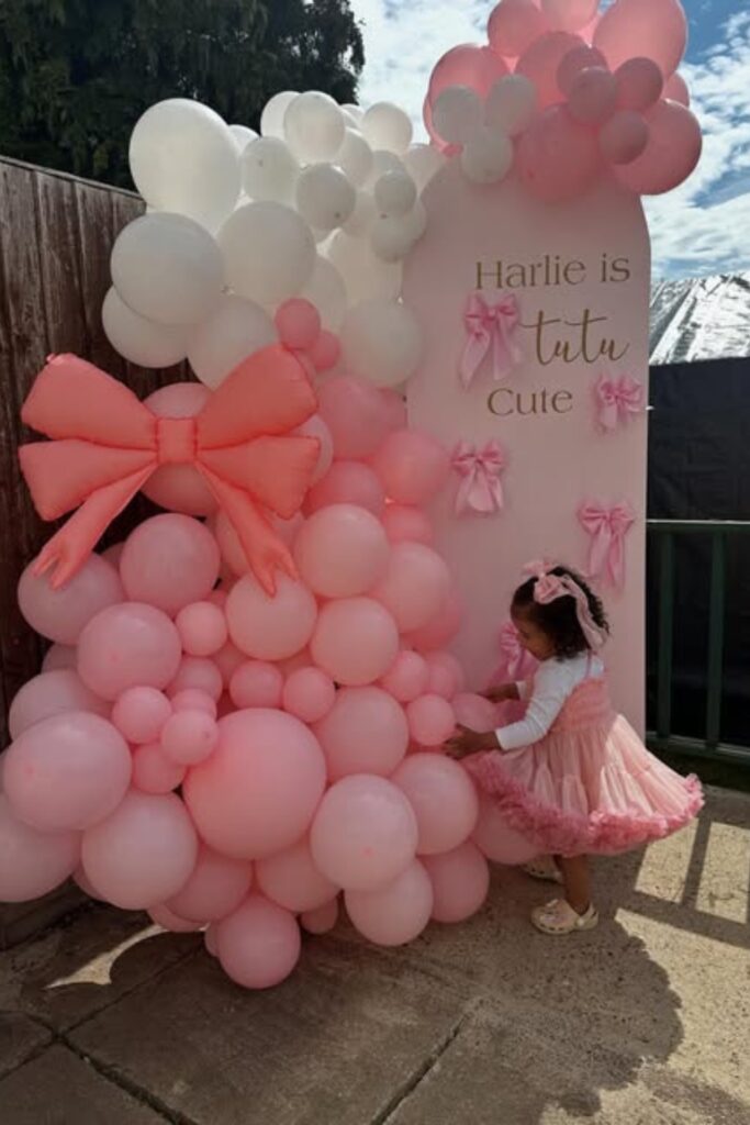A bow and tutu theme is better for little girls who love pretty details. This backdrop works best outdoors, where sunlight highlights pink balloons and oversized bows.