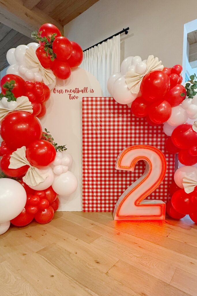 You can use red and white balloon clusters, a gingham backdrop, and greenery accents. Add a glowing marquee “2” for a bold focal point.