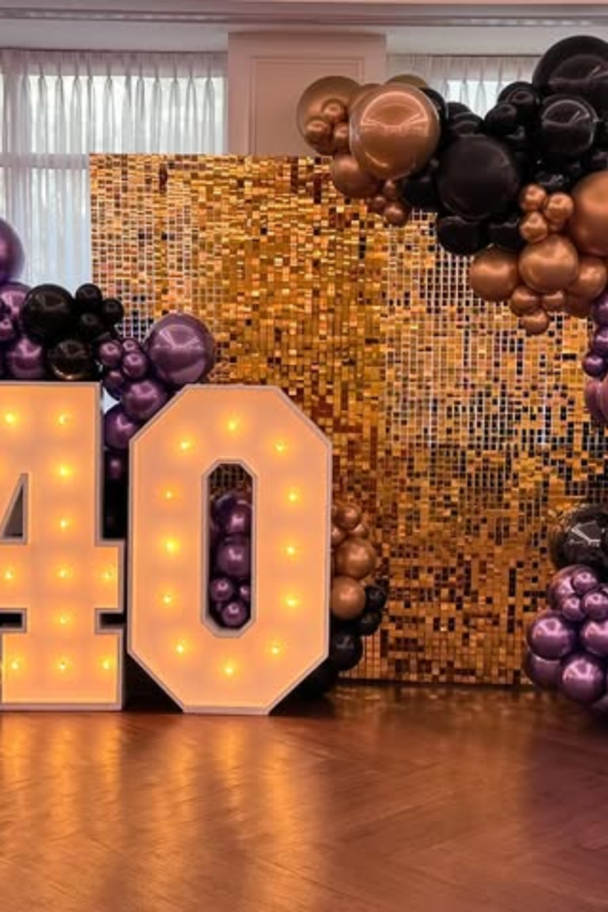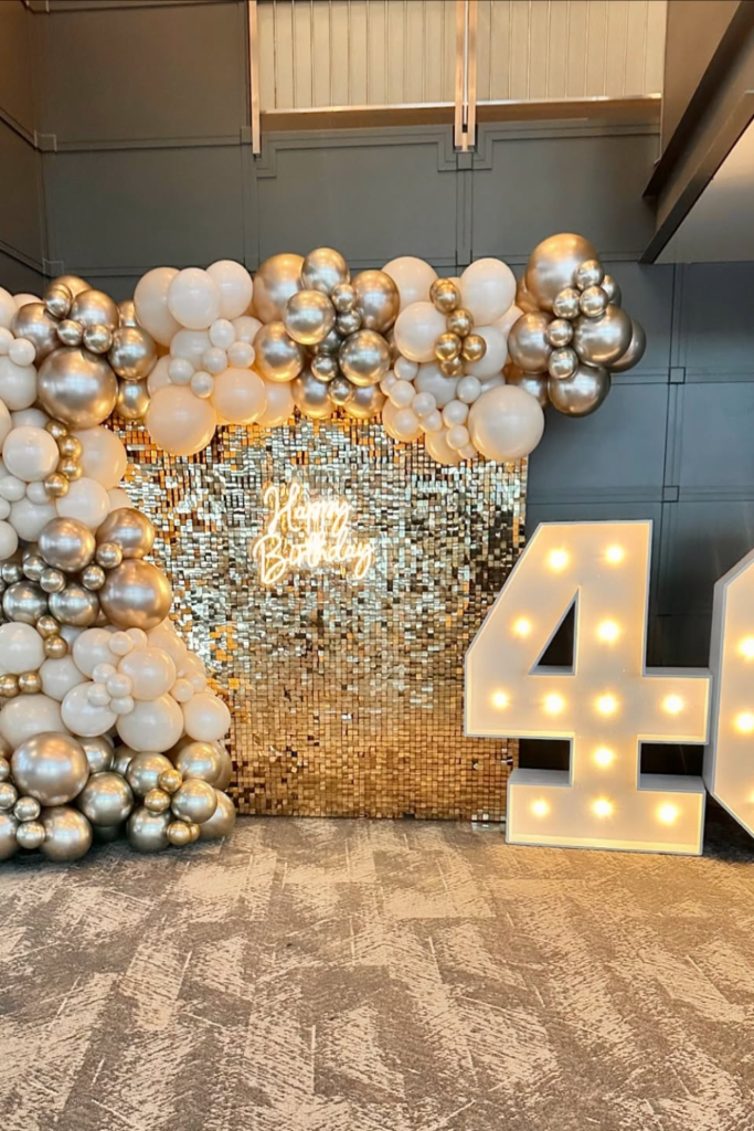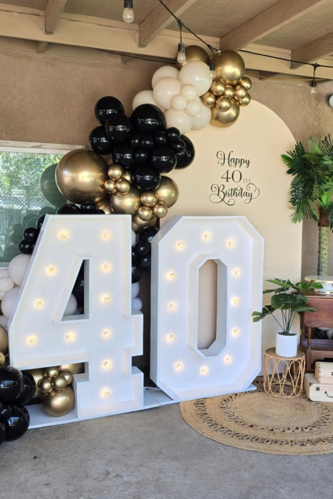 Place it on a dark backdrop so the glow actually stands out instead of getting lost. Pair it with black, gold, and chrome balloons to reflect the light and add dimension.