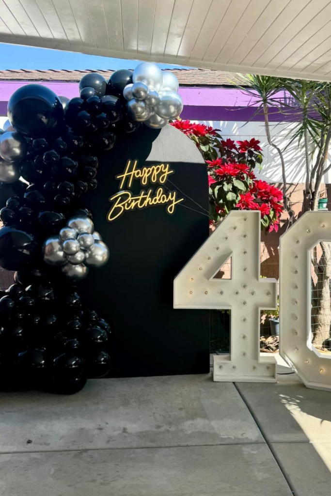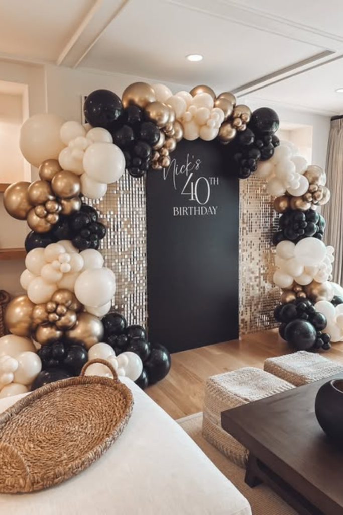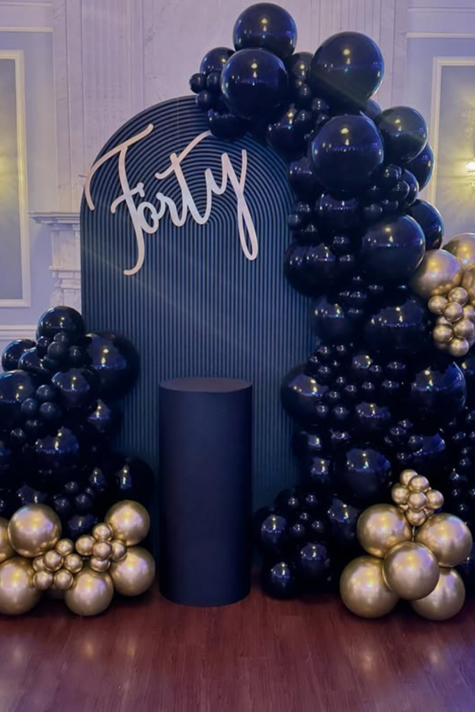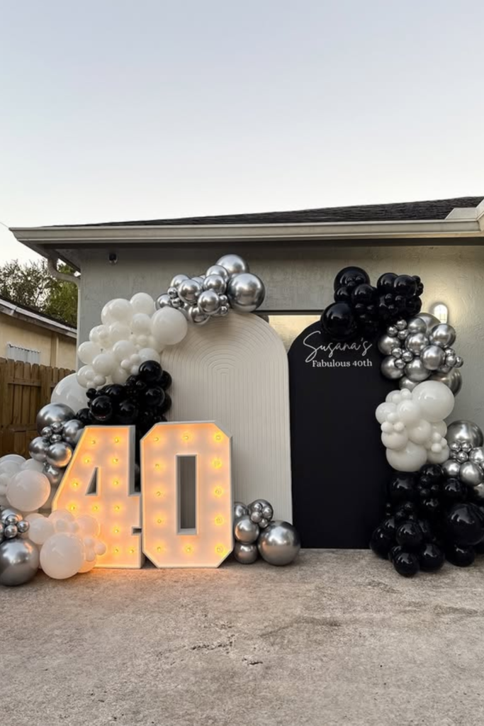 Go heavy on black balloons with touches of silver to keep it sleek, then anchor everything with a solid backdrop sign.