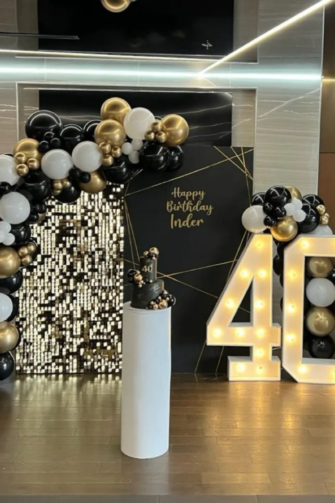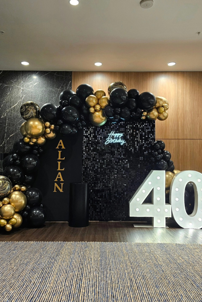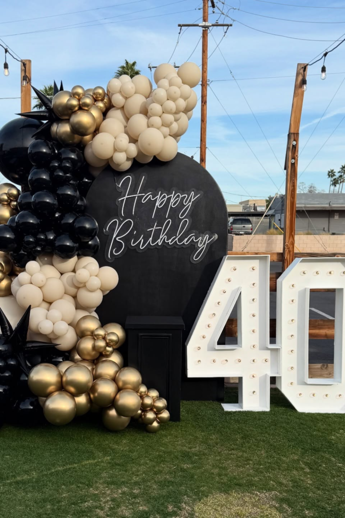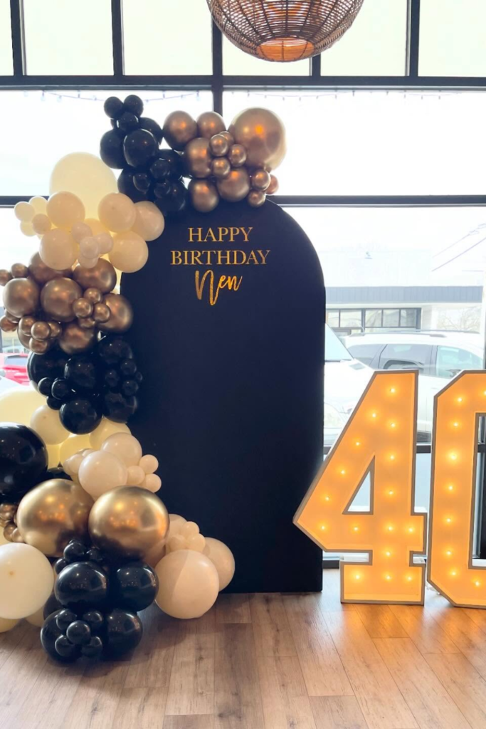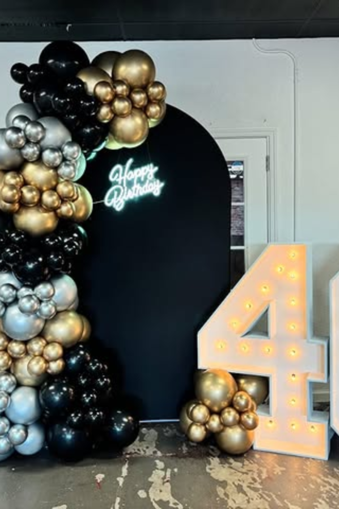 Go heavy on black balloons with touches of silver to keep it sleek, then anchor everything with a solid backdrop sign.