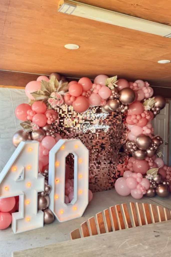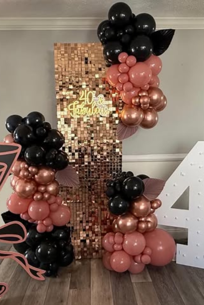 Build around it with black, blush, and rose gold balloons. Keep the backdrop narrow so it doesn’t take over the room.