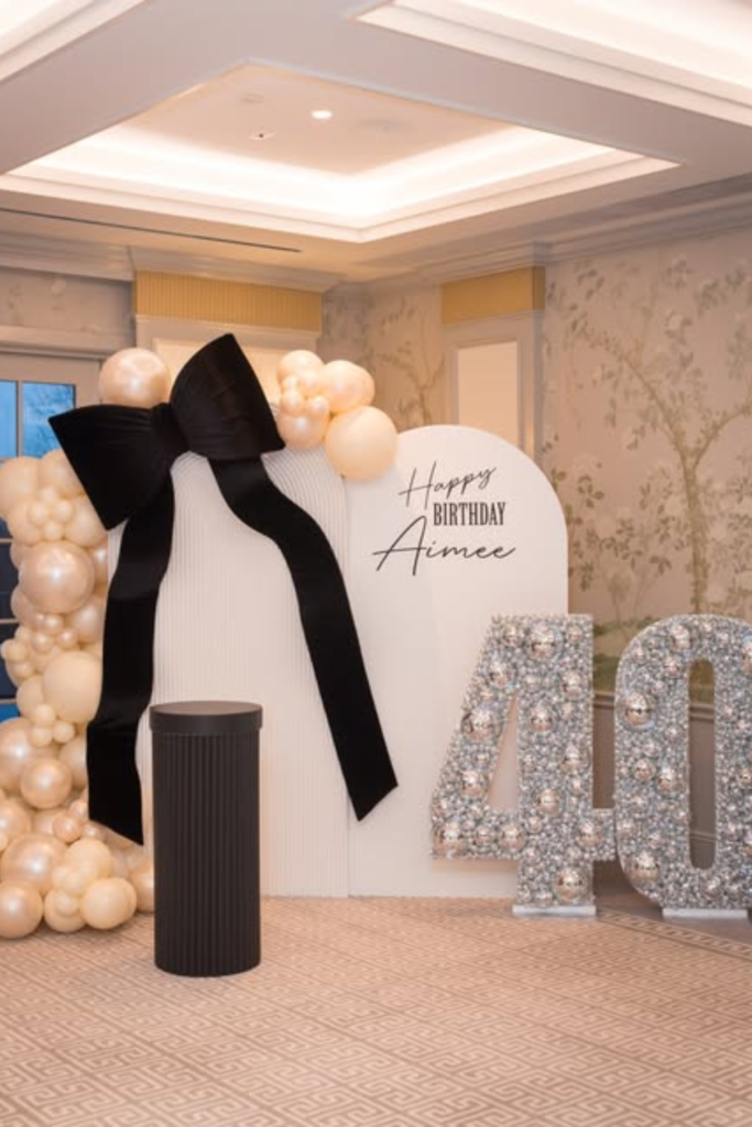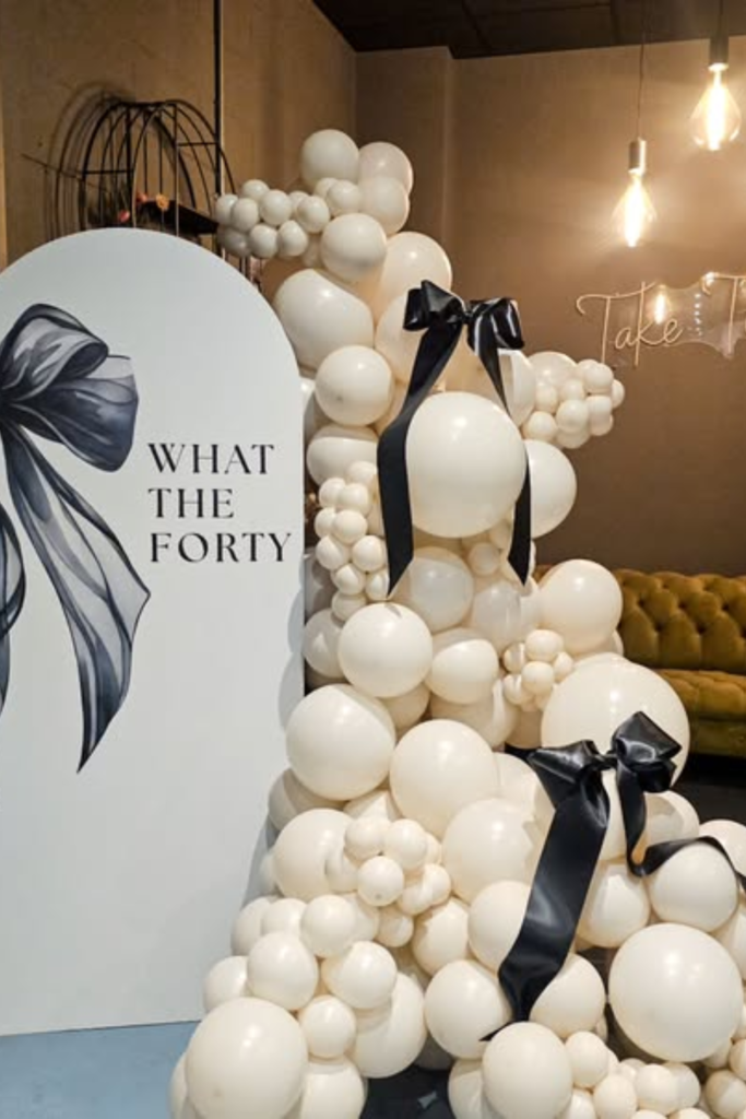 Use a neutral backdrop. Add a large black bow to create contrast. Keep balloons in soft cream or champagne tones so the bow stands out.