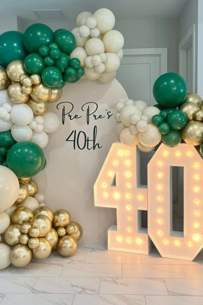 Rich green tones like this instantly make the setup feel fresh but still elevated. Mix deep green with cream and metallic gold balloons.