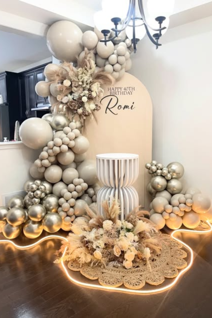 Stick to beige, cream, and muted gold balloons, then add dried florals for texture and depth. Floor strip lighting around the base adds a warm glow.