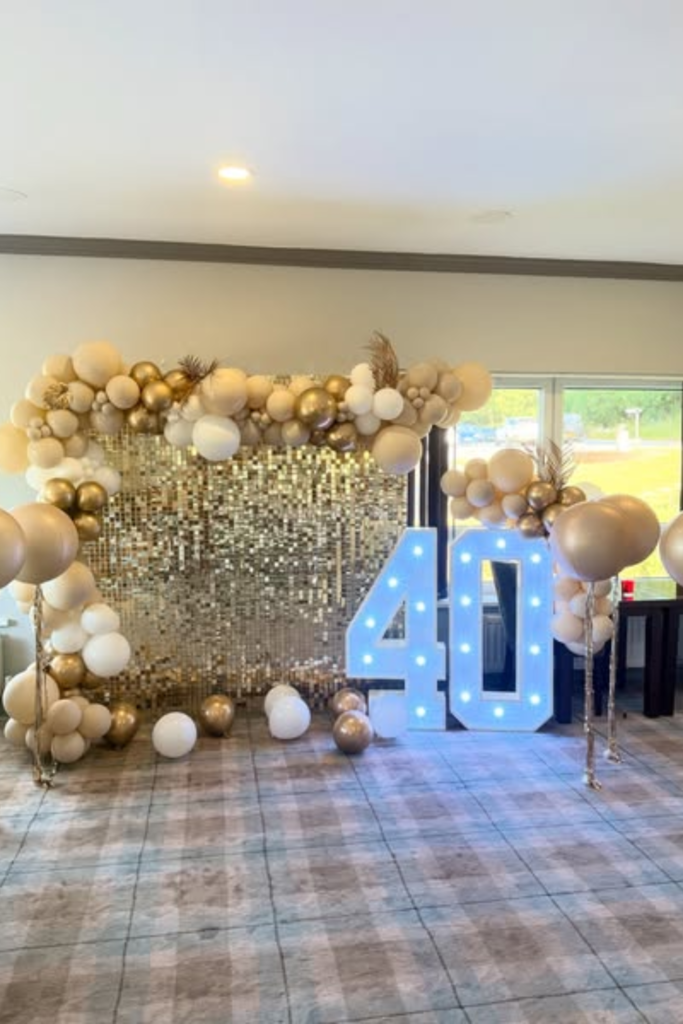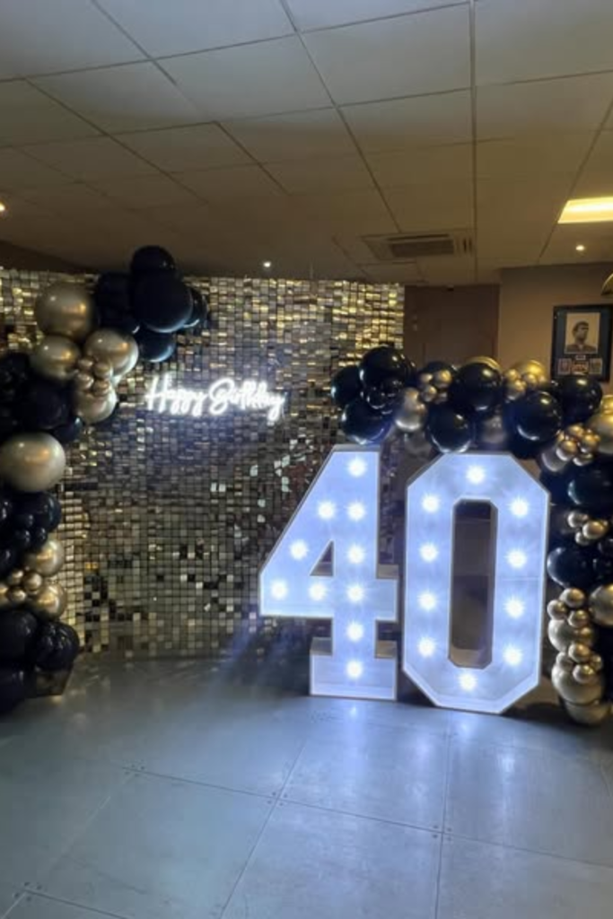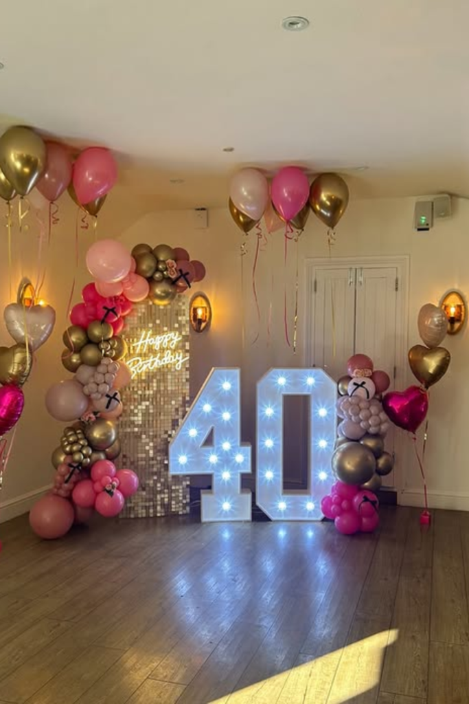 Add helium balloons with ribbons to fill vertical space. Warm wall lights plus glowing numbers create layered lighting that keeps the area bright.
