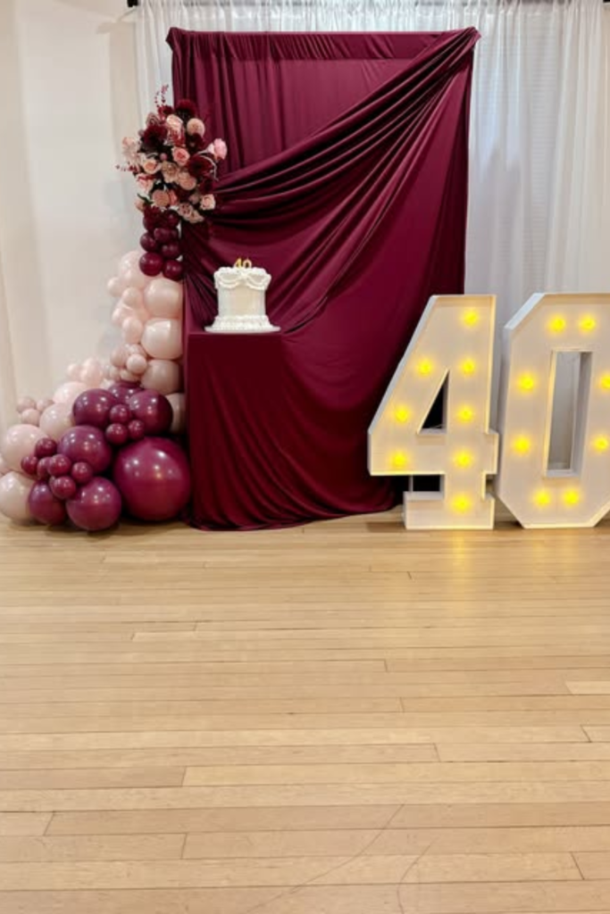 Pair it with blush and wine-toned balloons to keep everything cohesive. Warm marquee lights on the side add just enough glow.