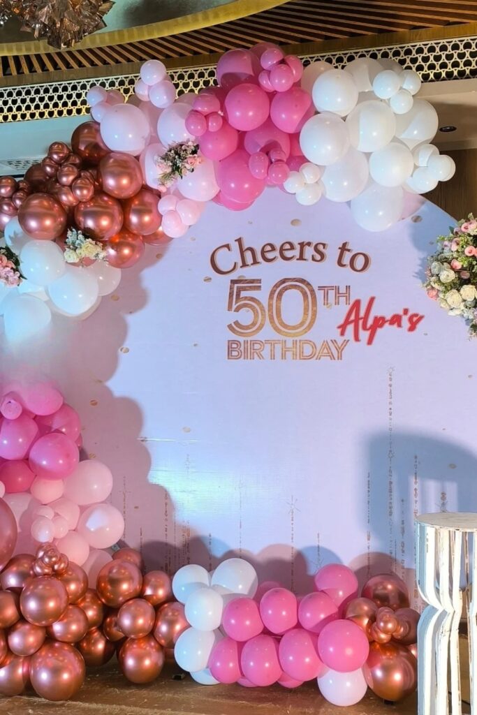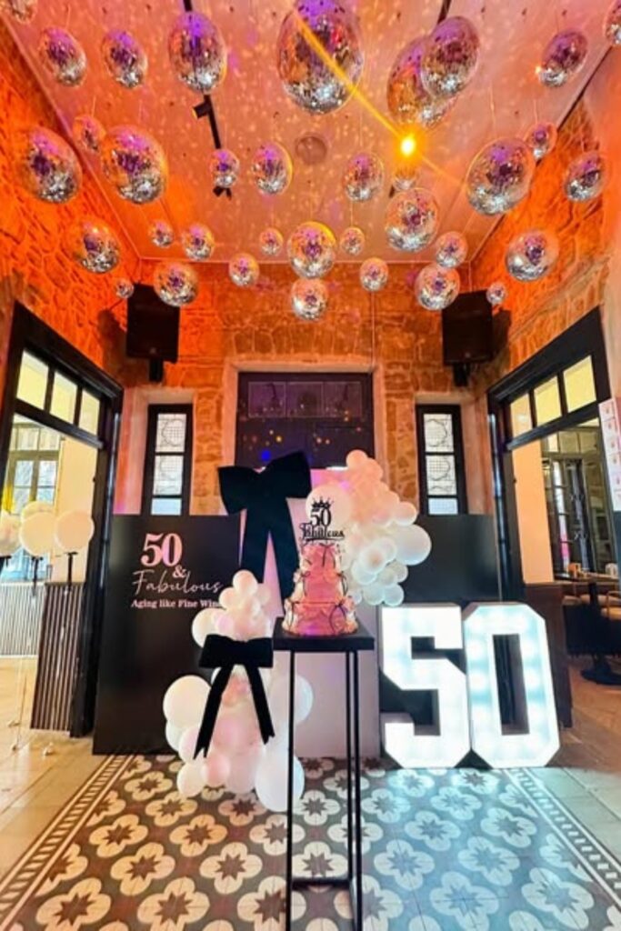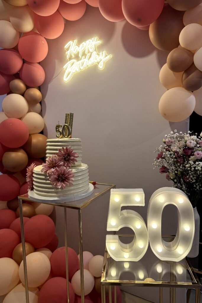 Pair it with a bold “50” marquee and clean balloon decor to keep the setup sharp. It is a strong way to make guests feel the celebration the second they walk in.
