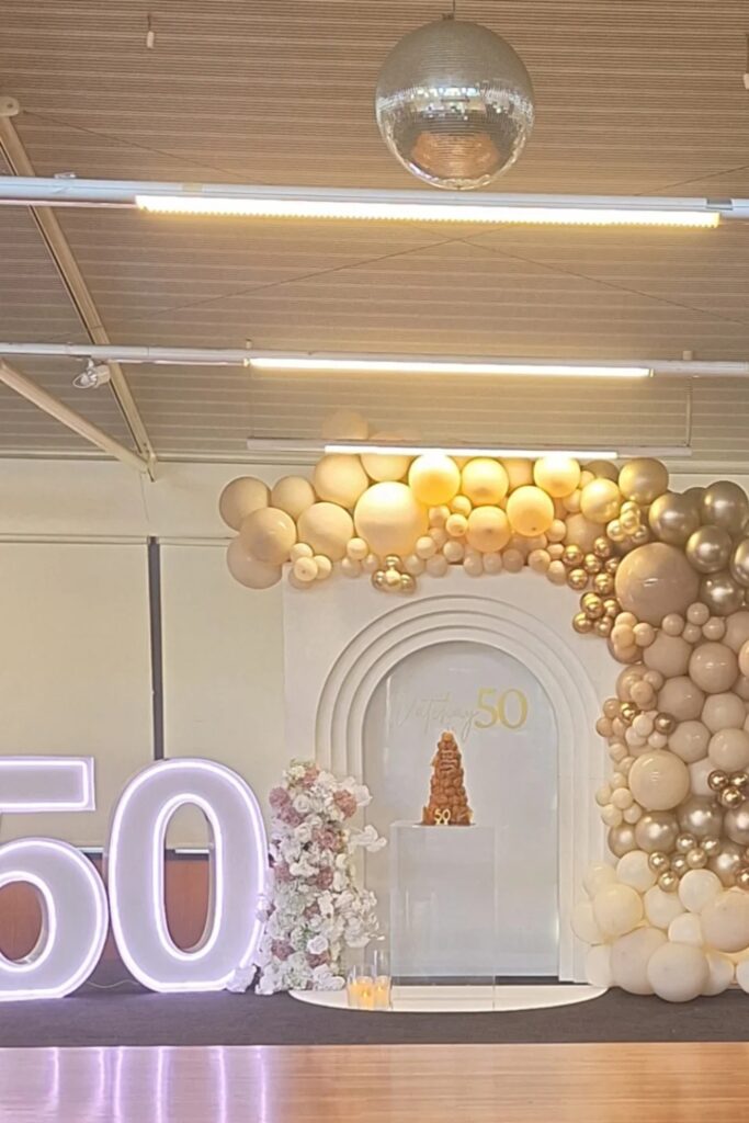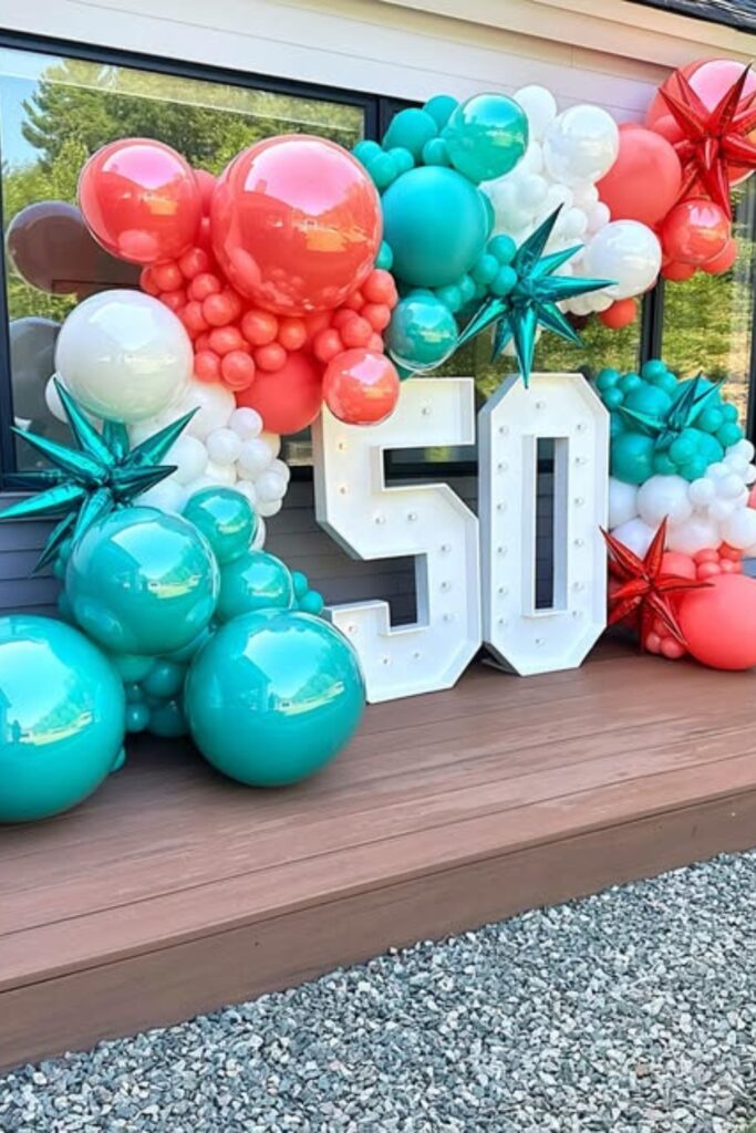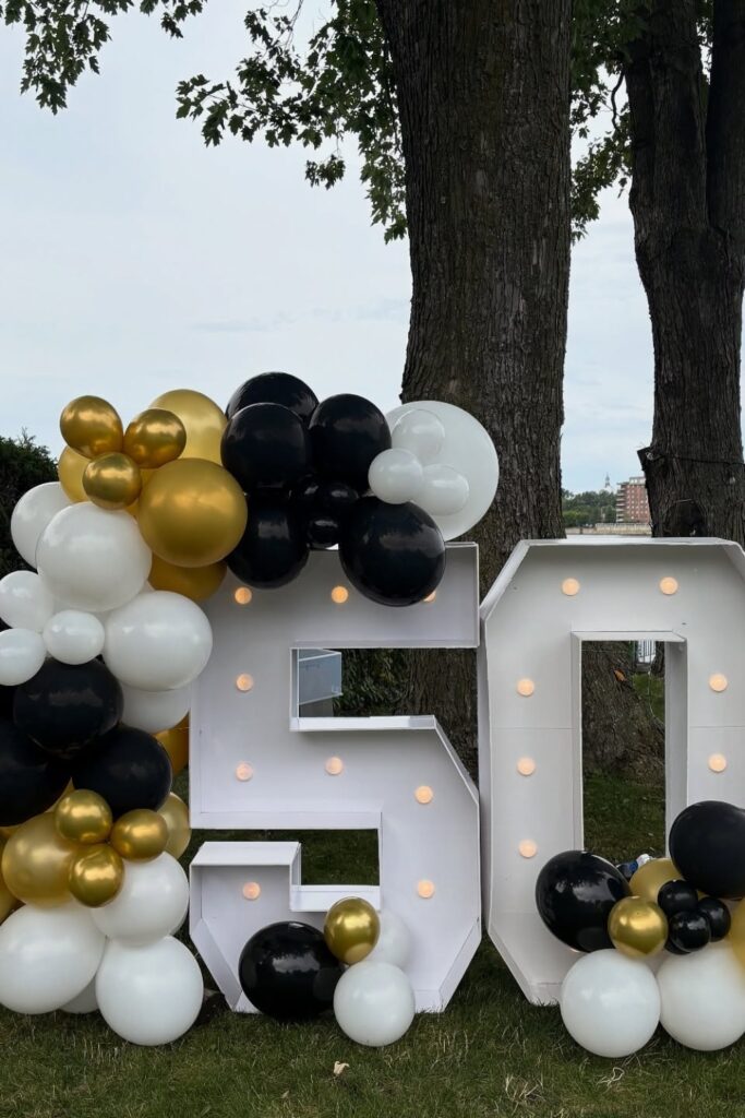 Oversized “50” marquee lights add bold contrast, while layered balloons build depth around the arch.