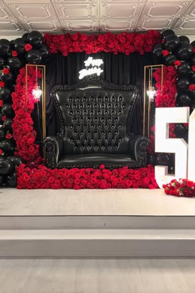 The black throne chair framed by red roses and black balloons is perfect for a stage or photo moment.
