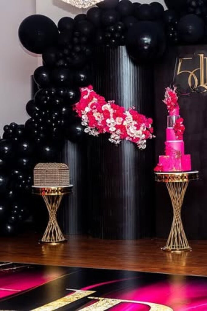 This bold backdrop mixes matte black balloons with bright pink florals for strong contrast.