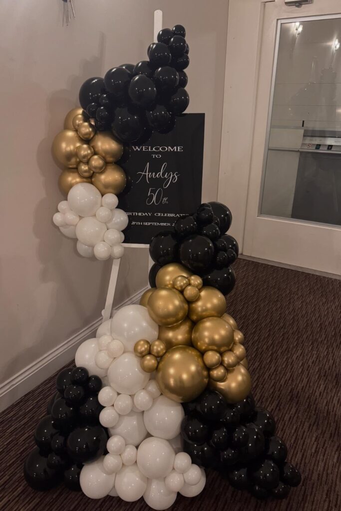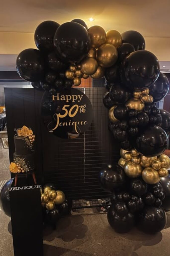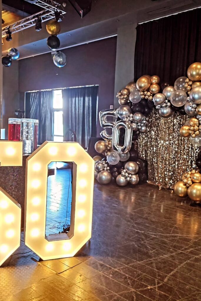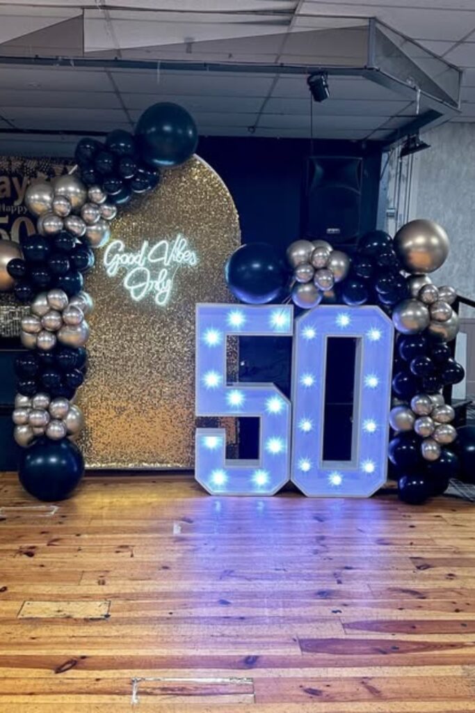 The mix of silver, gold, and black balloons adds texture and shine. Marquee “50” lights anchor the space.