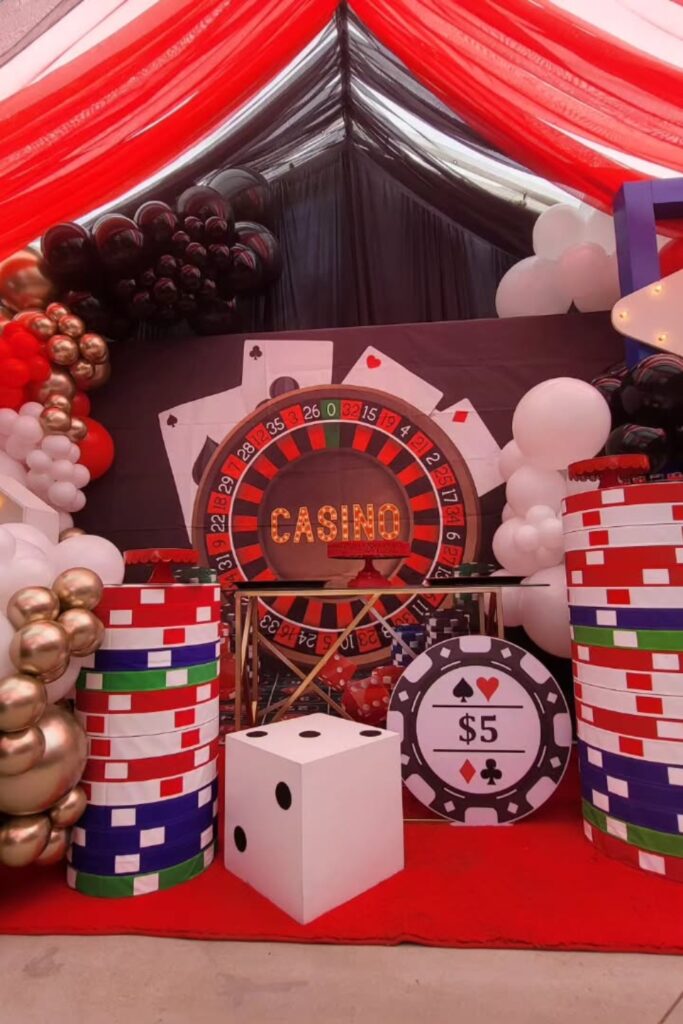 This setup turns your space into mini Las Vegas. Oversized poker chips, dice props, and red drapes create a lively casino vibe.