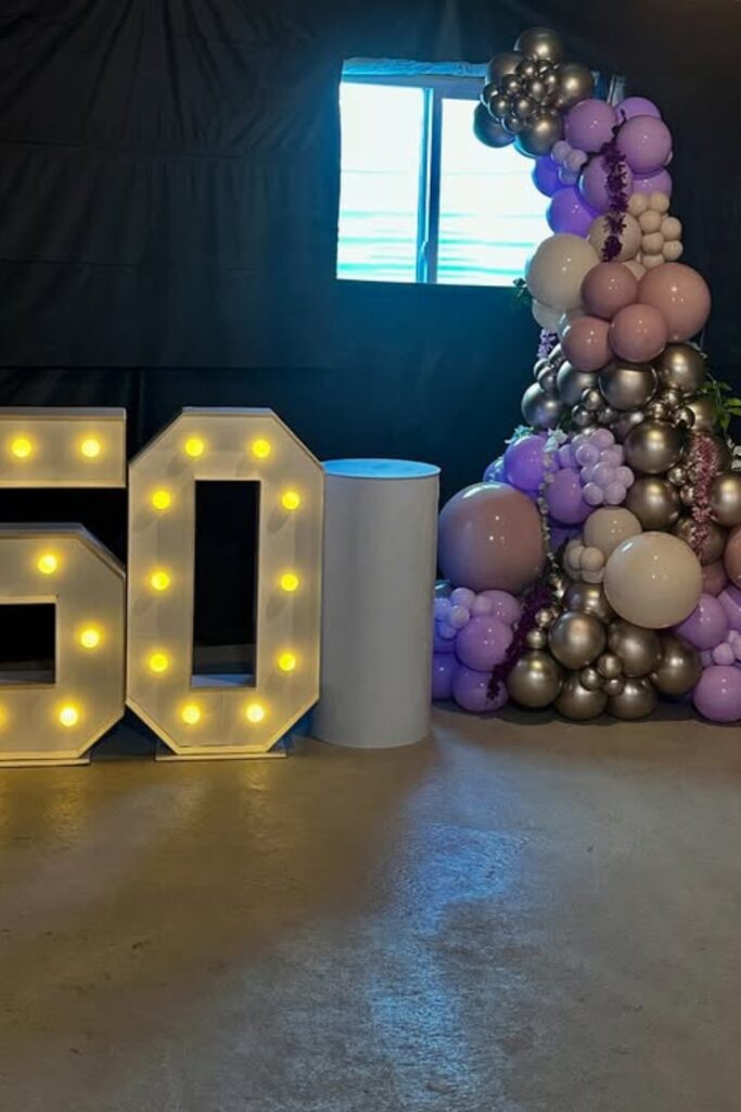 The tall cluster pairs well with marquee “50” lights to create a clean photo backdrop.