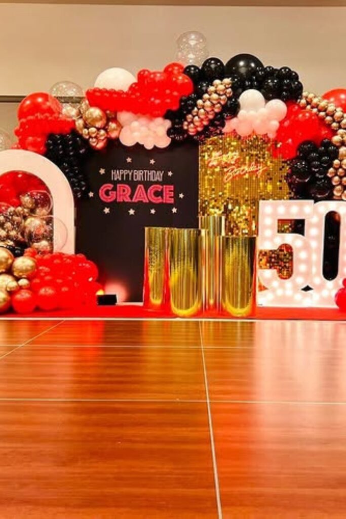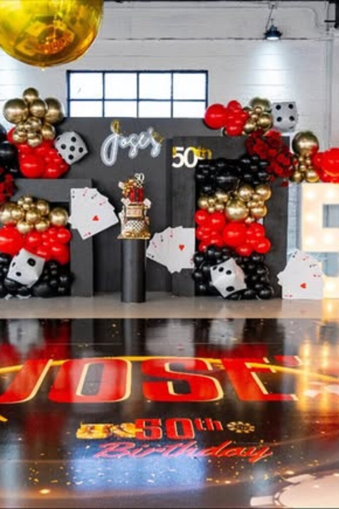 This setup turns your room into a lively casino scene with red, black, and gold balloons. Dice props, playing cards, and marquee “50” lights make the design pop.