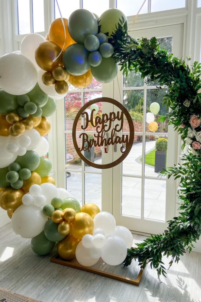 Layer soft white, sage green, and gold balloons with trailing greenery to give the arch.