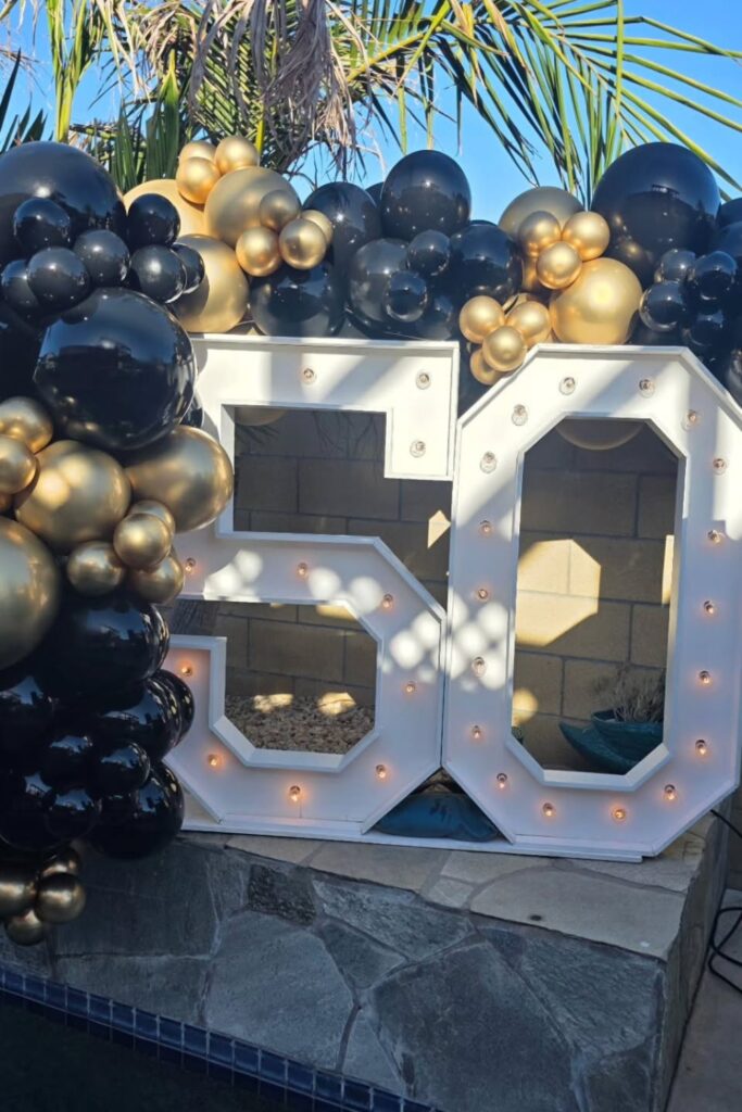 This black, white, and gold balloon cluster wrapped around marquee “50” lights creates a clean, timeless look.