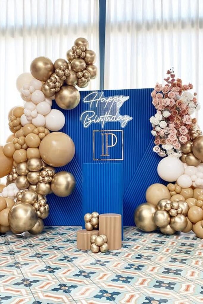 This elegant setup mixes soft gold and white balloons against a bold blue backdrop for a clean, modern look.