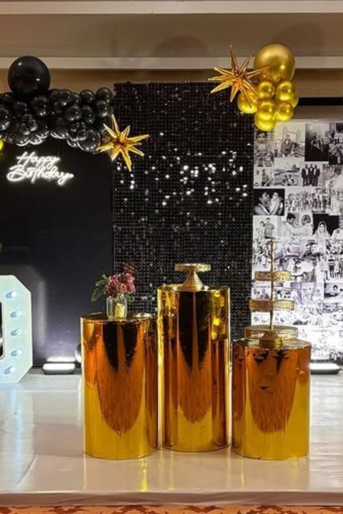 This gold shimmer wall with black and silver balloons creates a sleek, modern party vibe.
