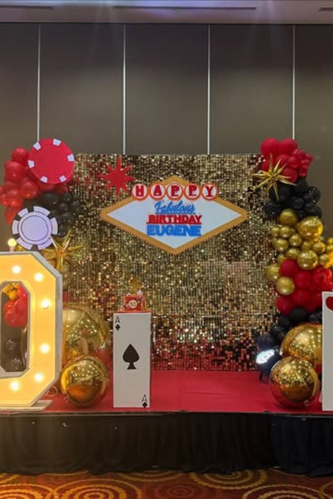 It works best on a wide wall or stage, creating a full party backdrop. Warm lighting enhances the gold tones and gives the whole look a fun, high-energy Vegas feel.