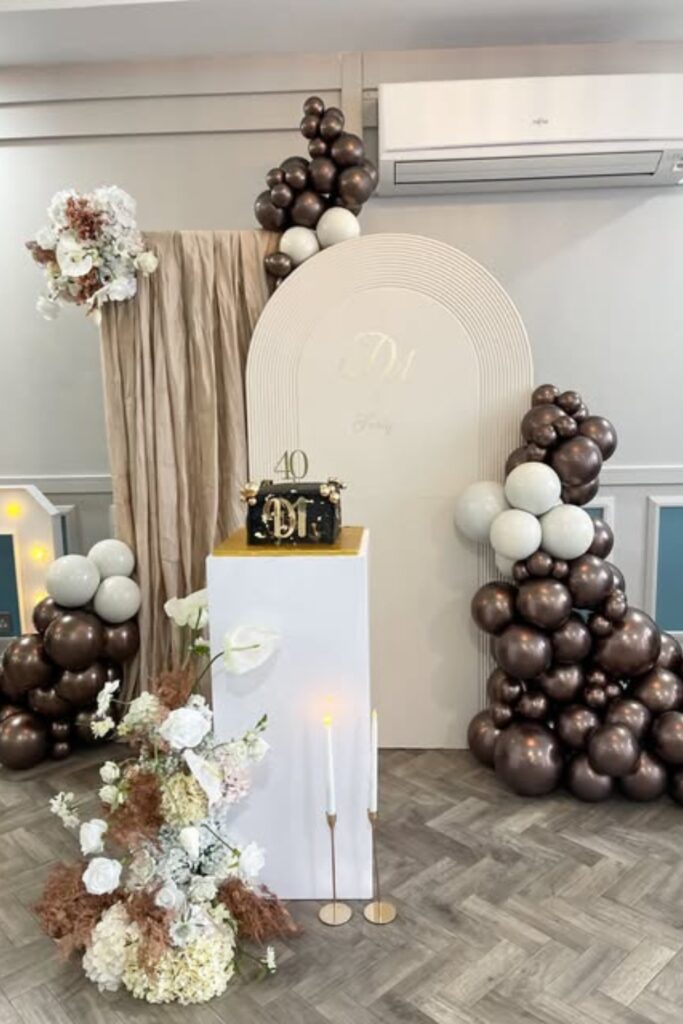 The mix of mocha and cream balloons around a clean arch creates a calm, elegant feel. Add dried florals and candles to keep the design warm and refined.