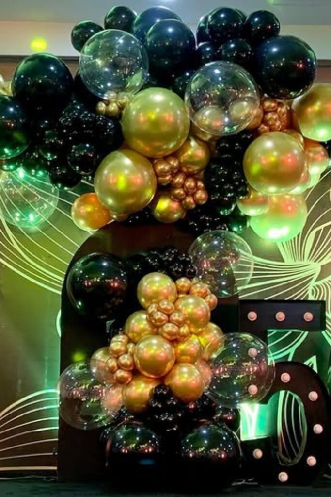 This bold balloon burst makes a strong statement for evening celebrations. The mix of gold, black, and clear balloons adds shine and depth, perfect for a stage or backdrop.