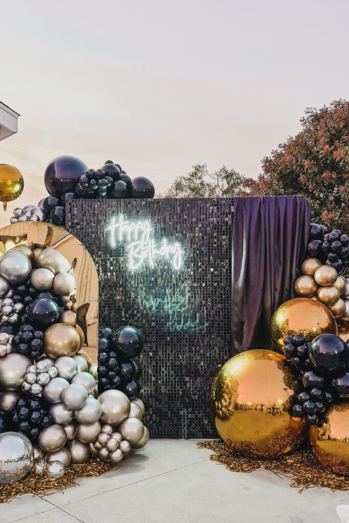 This metallic balloon backdrop with sequin curtains creates a bold, upscale vibe.
