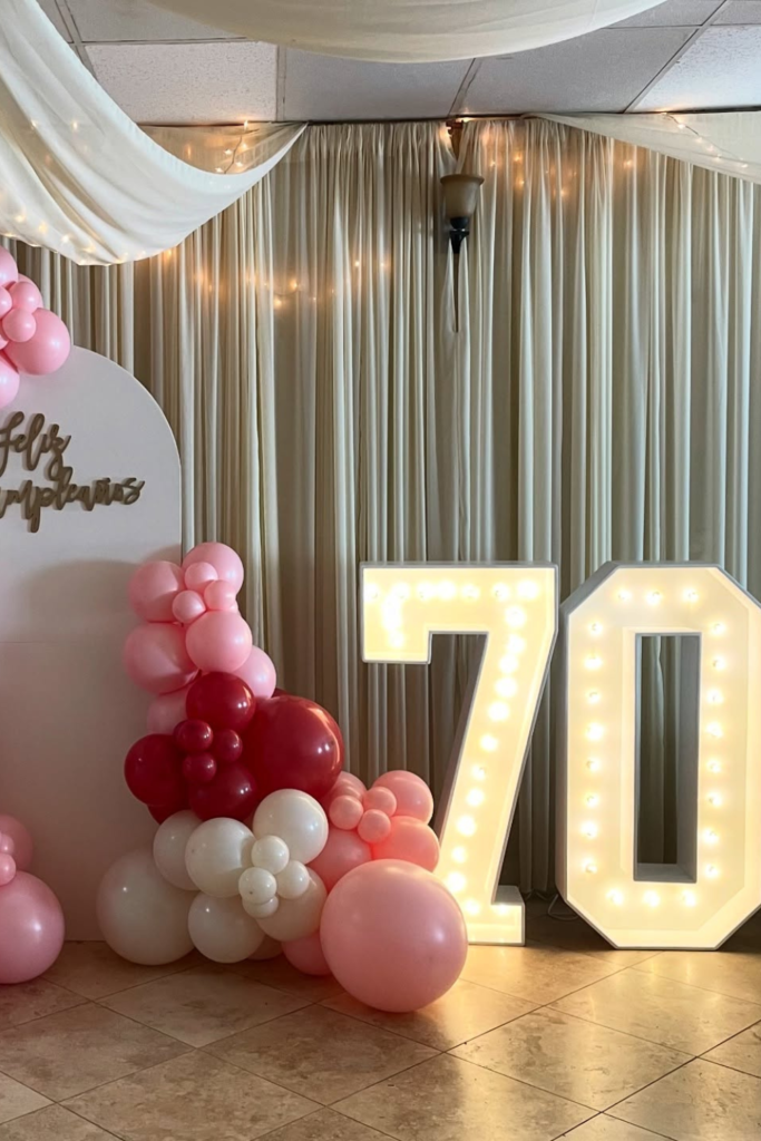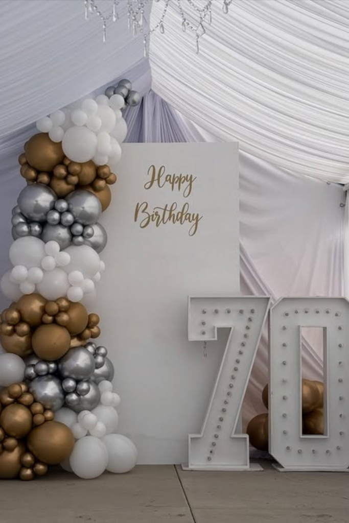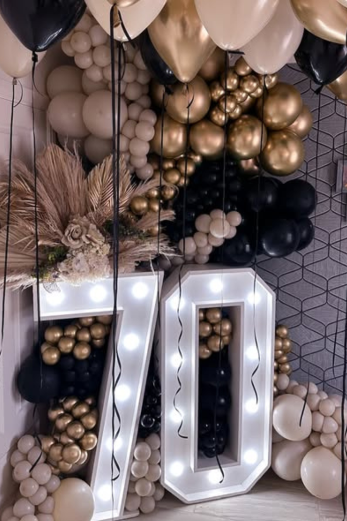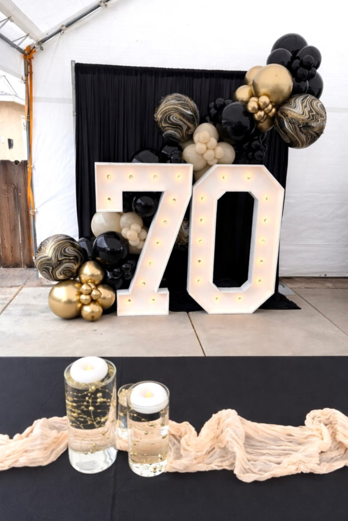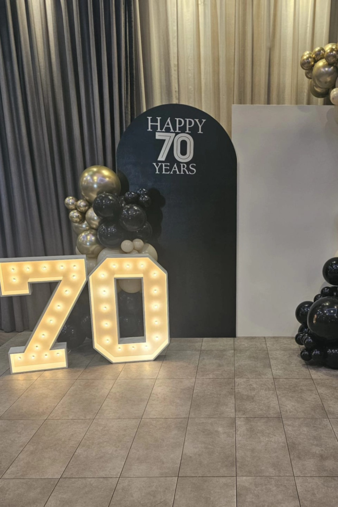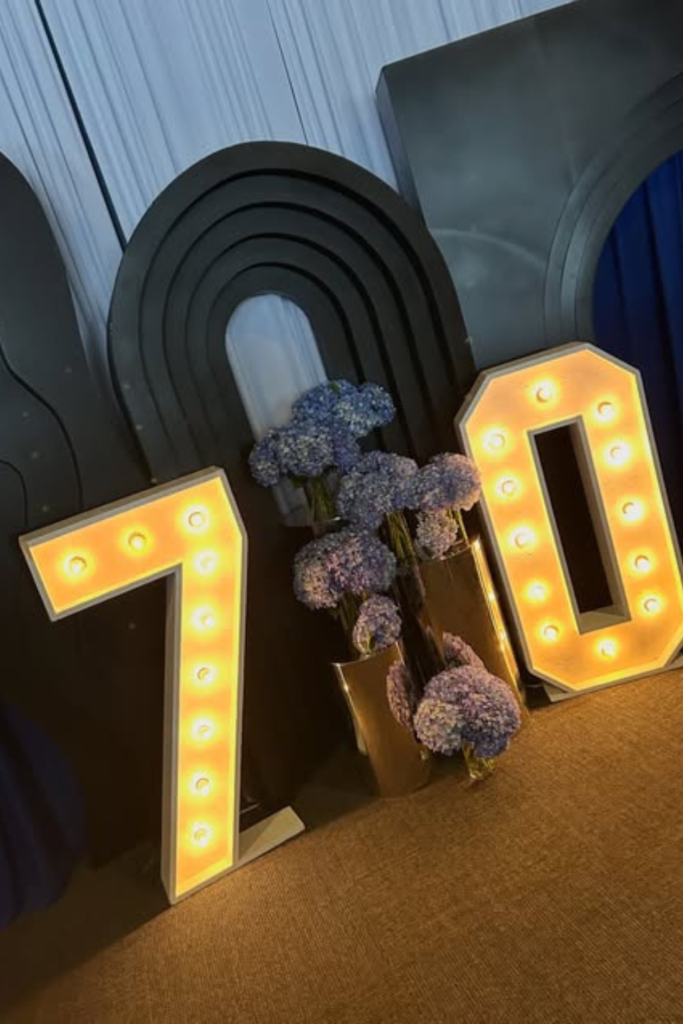 Nothing highlights the milestone better than glowing numbers. Light-up “70” works best in indoor venues or evening setups.