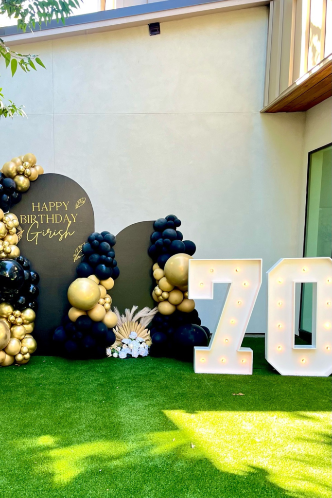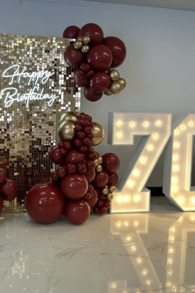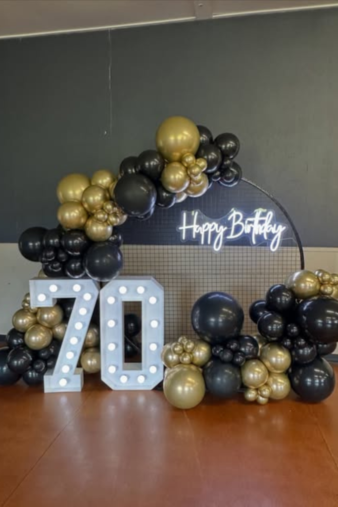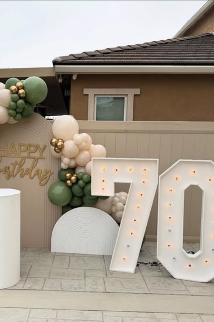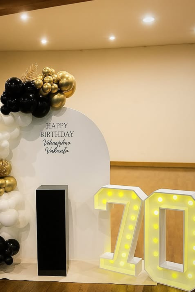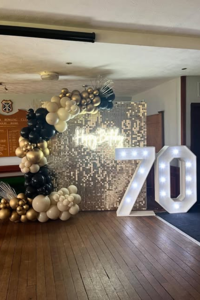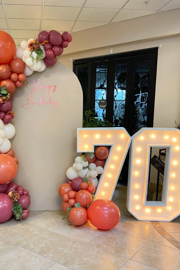 Nothing highlights the milestone better than glowing numbers. Light-up “70” works best in indoor venues or evening setups.