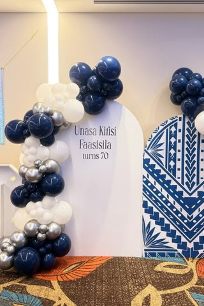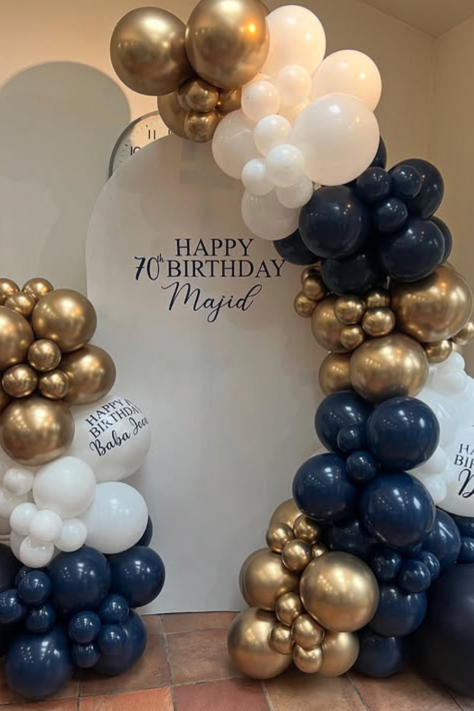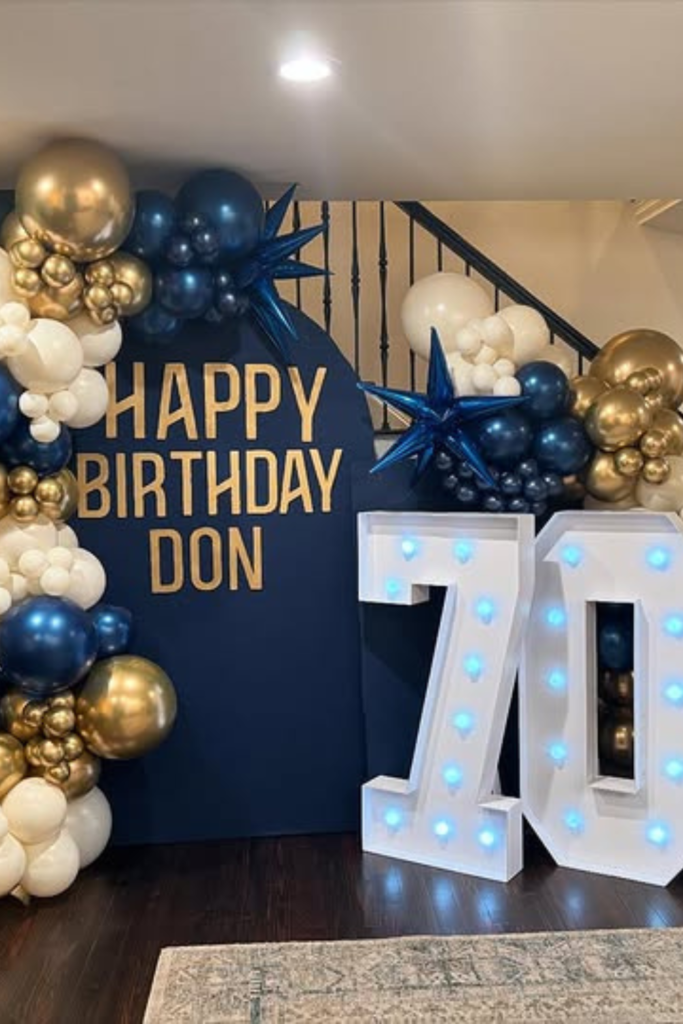 Deep tones bring a calm, mature feel that suits milestone birthdays perfectly. Navy, white, and gold work best for indoor home setups.
