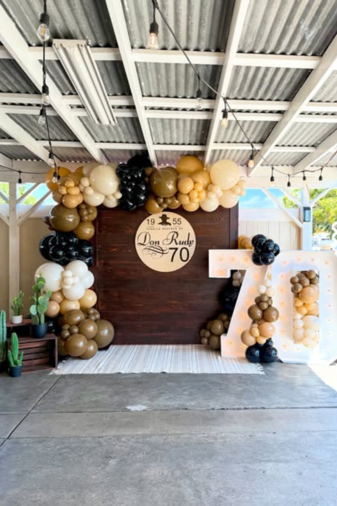 Use neutral balloons in black, beige, and gold to blend with the wood. Add simple plants or small décor pieces to fill empty corners.