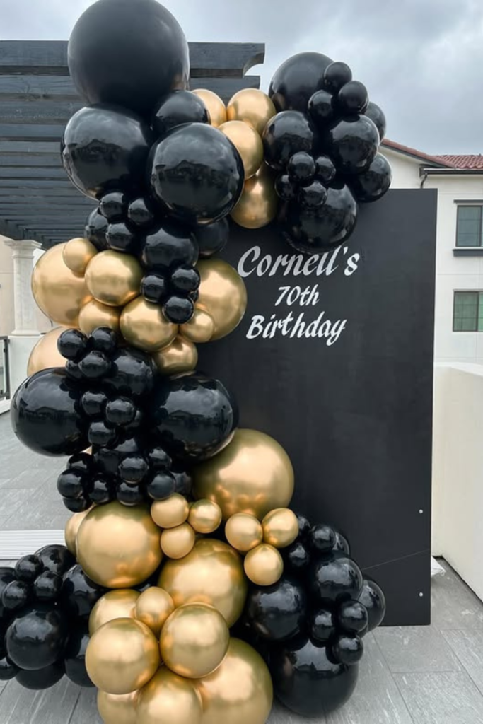 Black-and-gold balloon arrangement works best for outdoor patios, rooftops, or entryways where guests arrive and naturally pause.