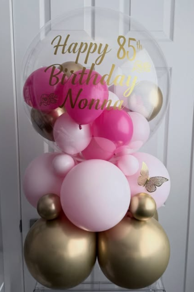 Use a clear bubble balloon with their name and age in gold lettering, then fill it with soft pink and metallic balloons inside.