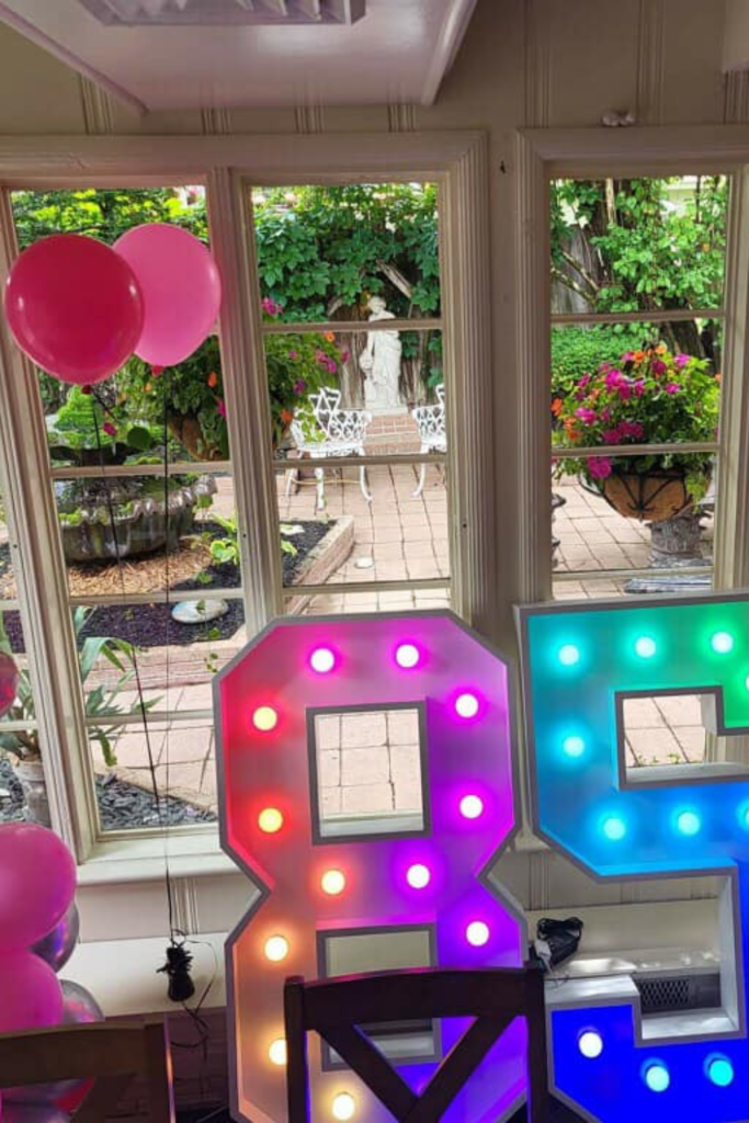 Make the age the star of the room. Large light-up numbers work best in a hall, living room, or party corner where guests naturally gather.