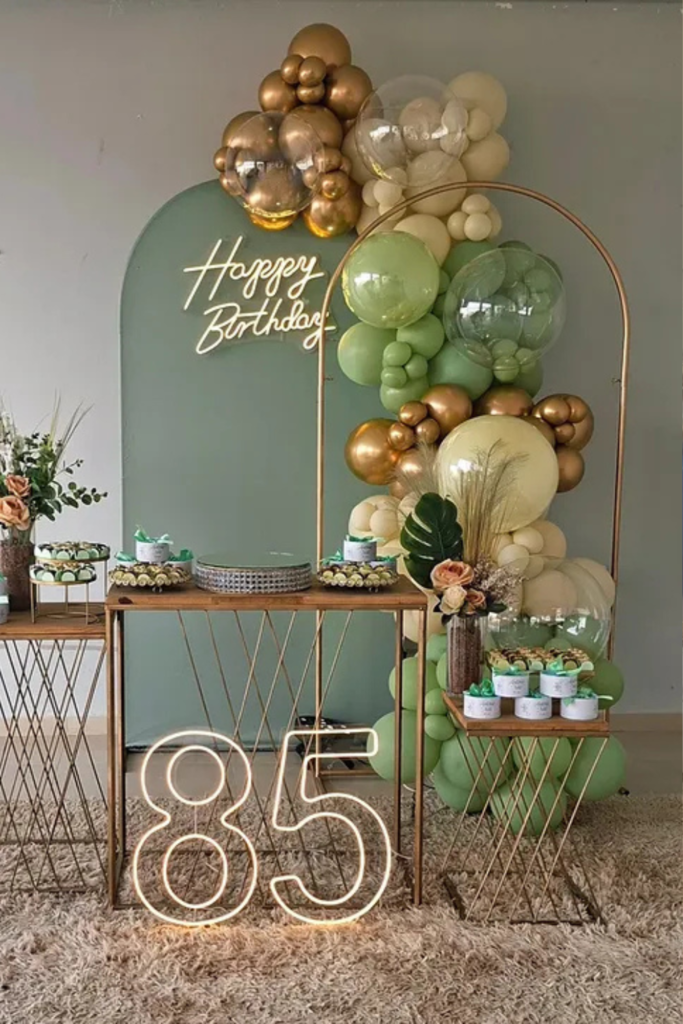 Use different shades of green balloons with small gold accents to keep it grounded and mature. Add a simple cake table with gold stands.