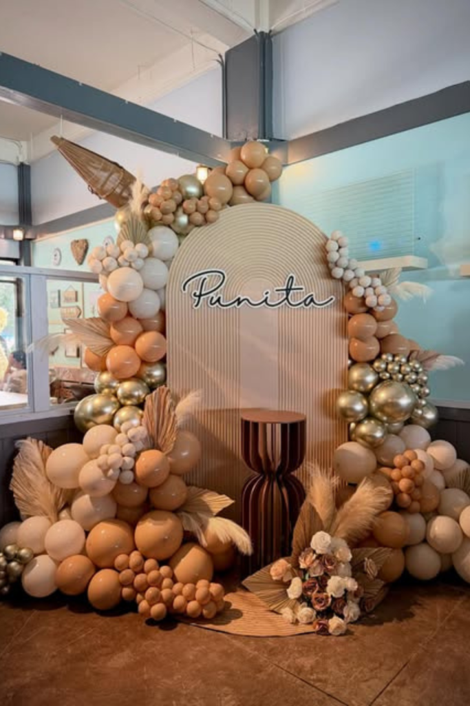 Use beige, cream, and muted-gold balloons, layered with dried leaves for texture. Add a simple arch backdrop with a name sign to keep it personal.