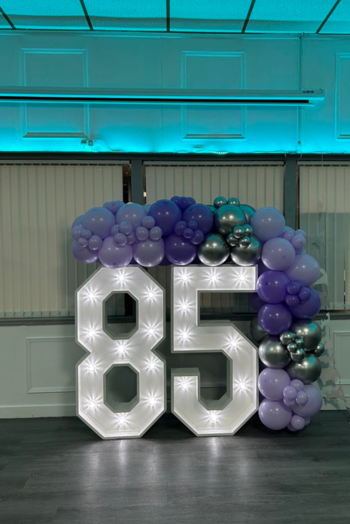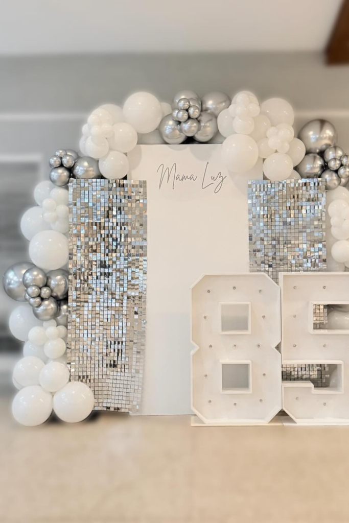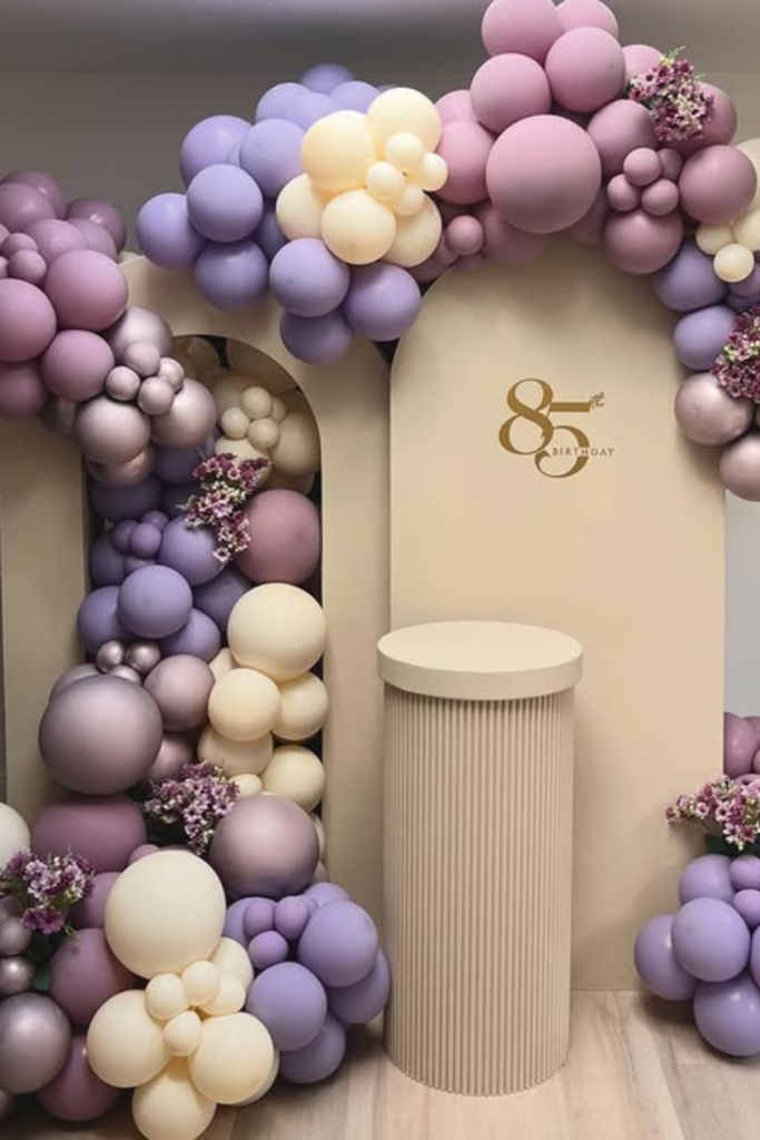 Use cool-toned balloon garlands in white and lavender, then place light-up numbers as the focal point. Keep the room slightly dim.