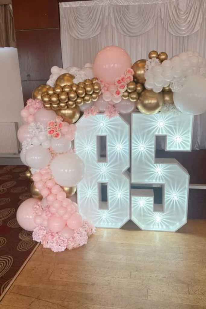 Use colorful light-up numbers to bring energy, then keep the rest simple with a few balloon clusters on each side.