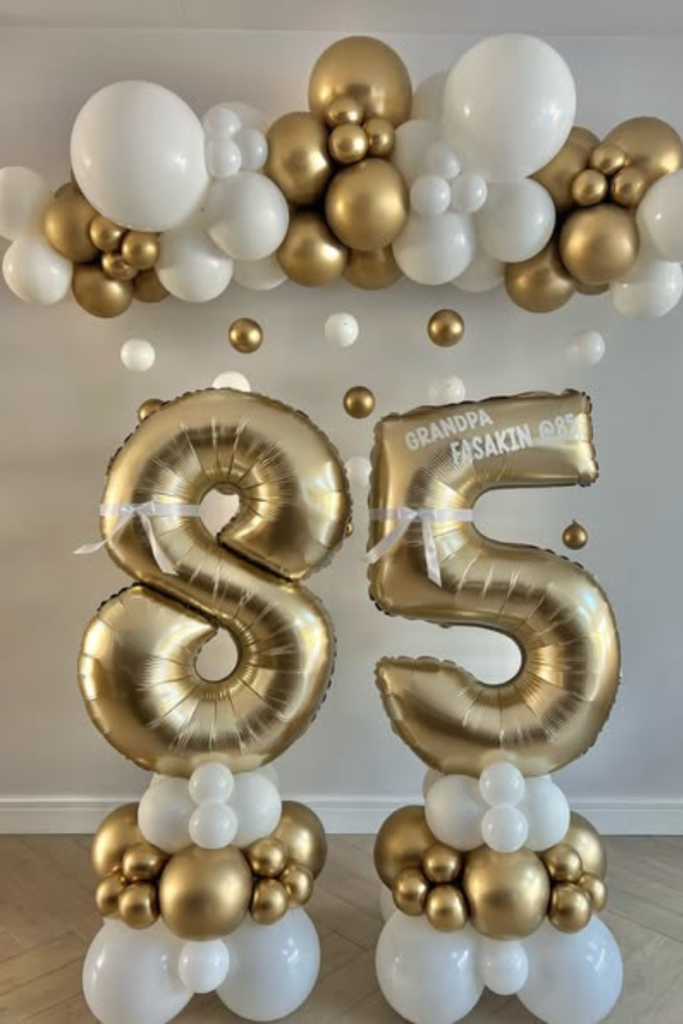 Use large gold foil number balloons and anchor them with small balloon clusters at the base. Add a matching balloon garland above to frame the space.
