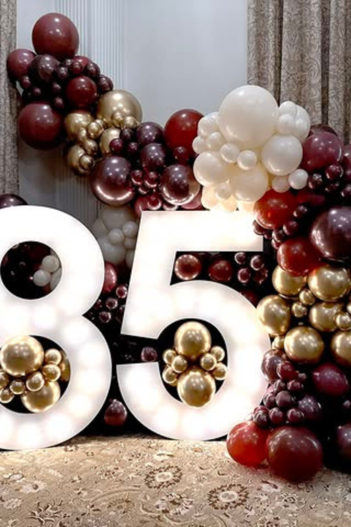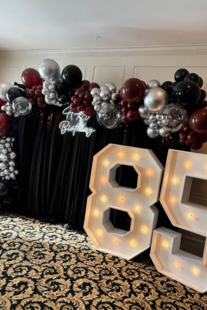 Layer balloons in deep burgundy, silver, and black for contrast. Light-up numbers bring warmth, so the setup doesn’t feel too heavy.