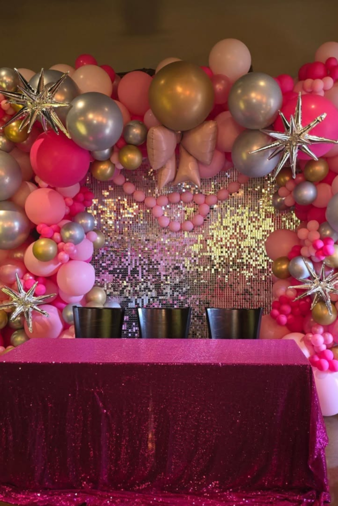 Build it with a shimmer backdrop, then layer pink, gold, and soft neutrals balloon garlands to add depth. Starburst accents add a bit of sparkle.