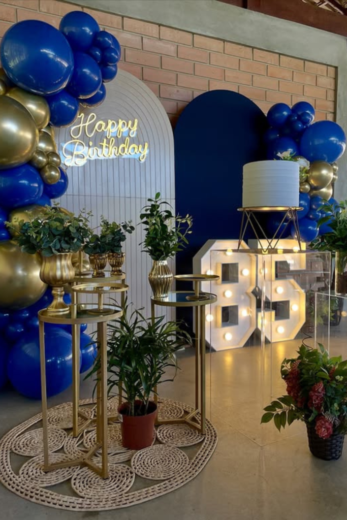 Use deep blue and gold balloons for a rich, mature look, then layer in plants and gold stands to soften it.