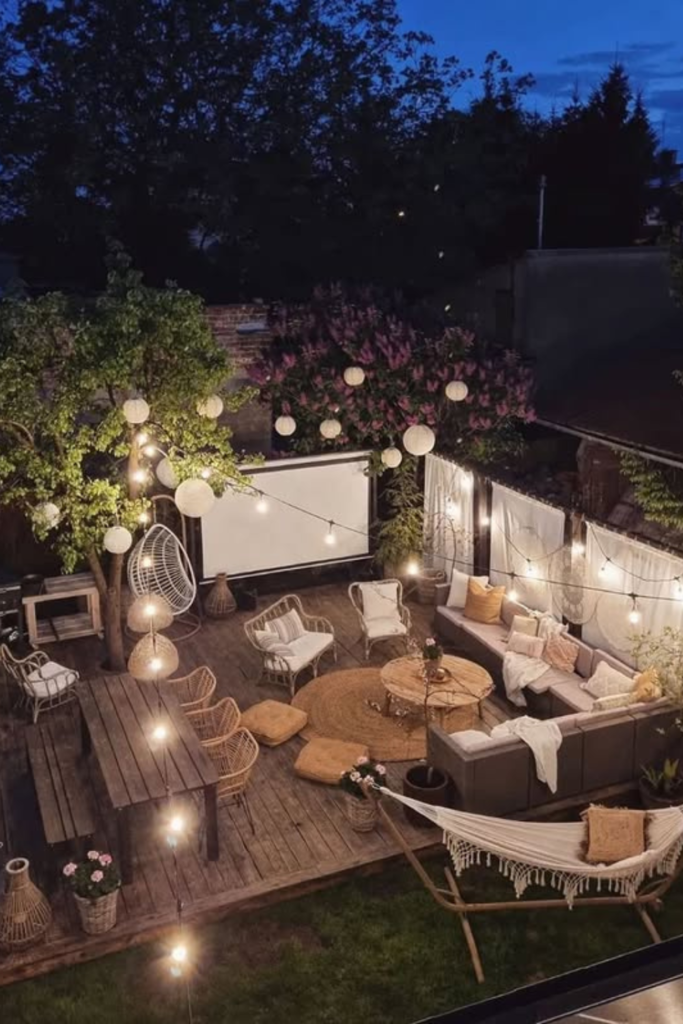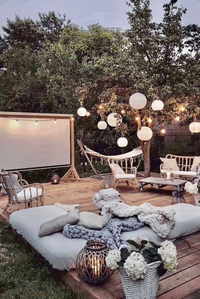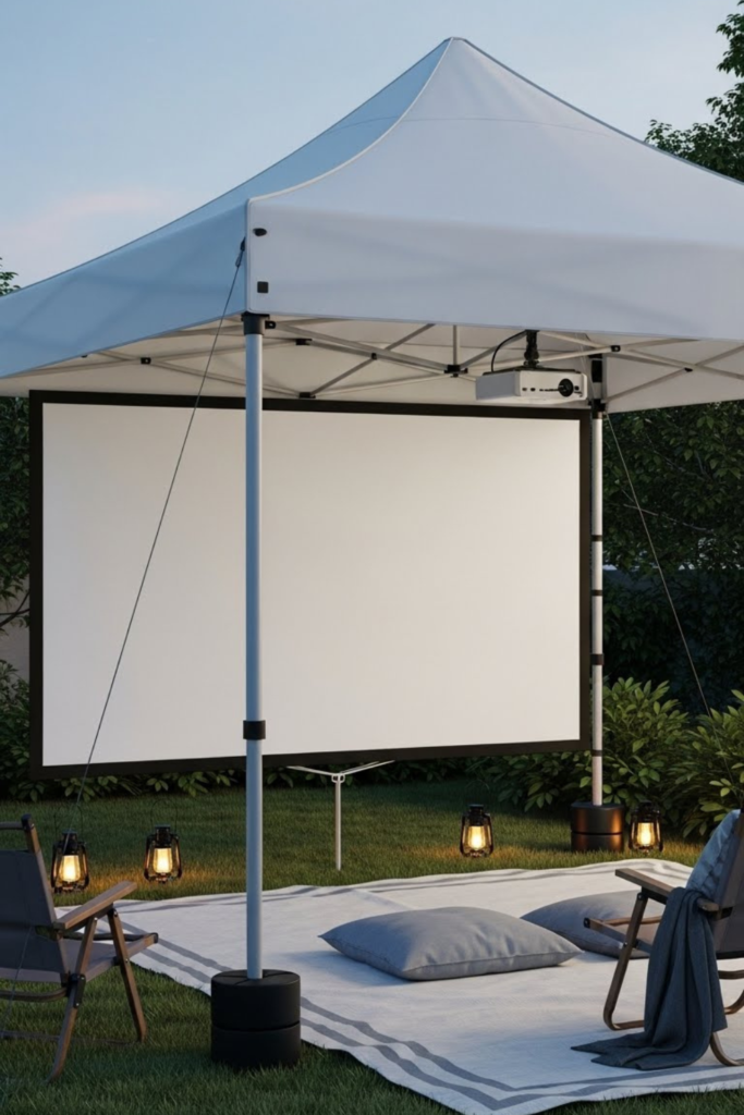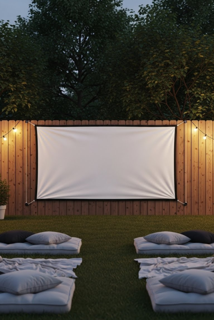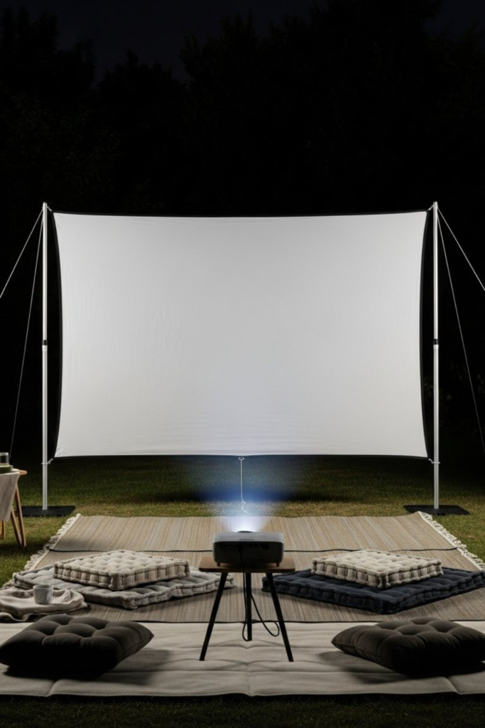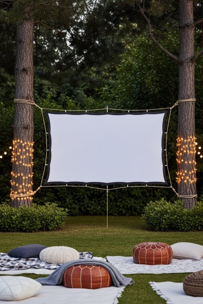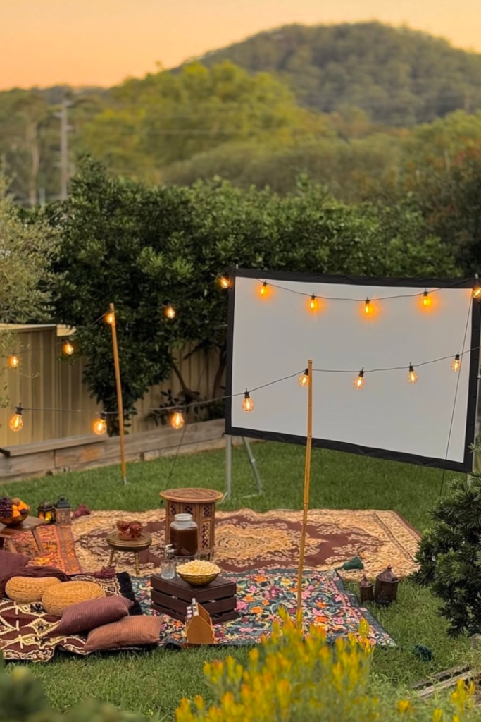 Keep lights away from the screen area and add a few ground-level candles for illumination; ideal for small backyards.